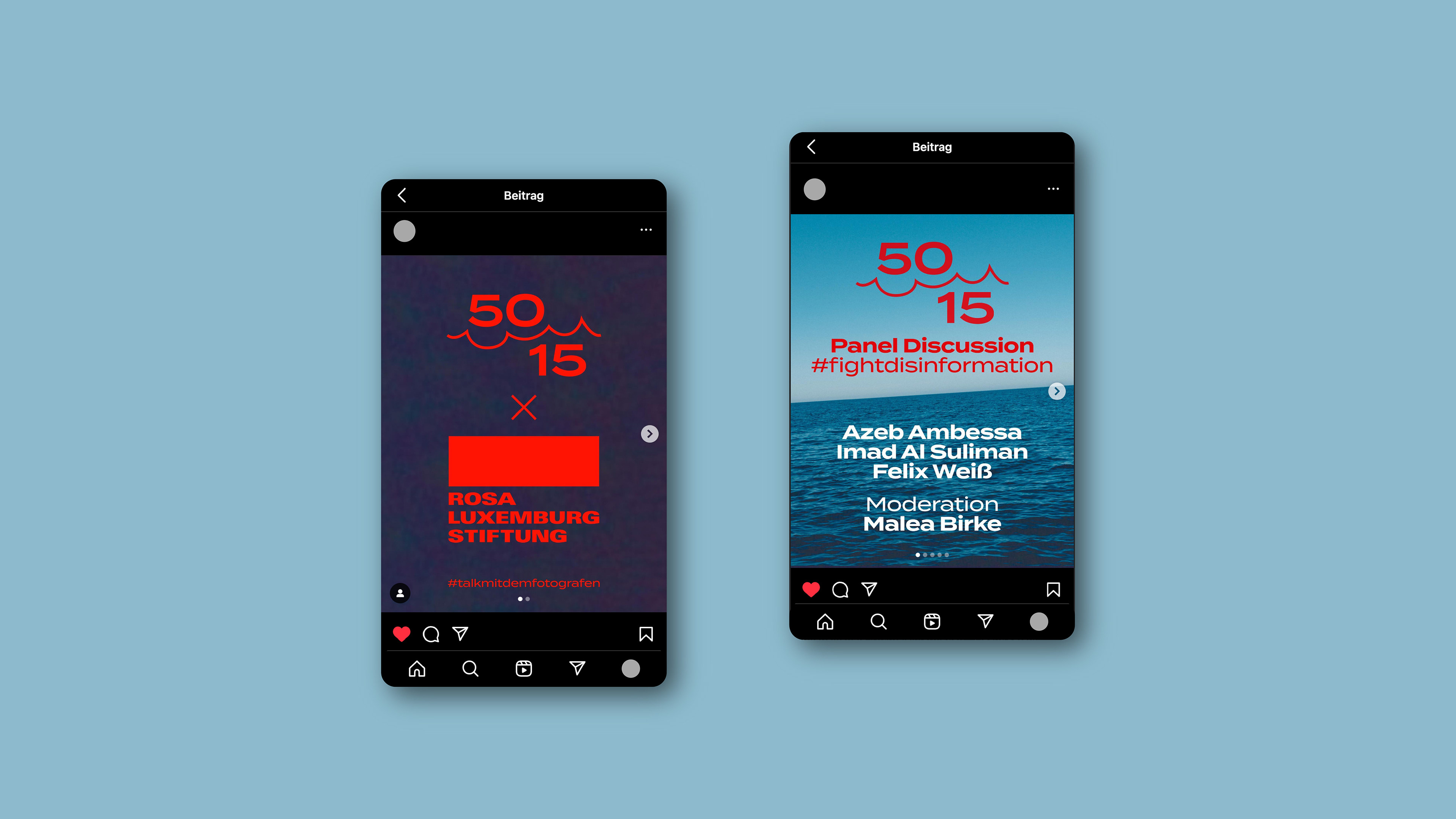FÜR DIE FOTOAUSSTELLUNG 50/15 VON MICHÉL KEKULÉ HABE ICH EINE EINHEITLICHE GESTALTUNG FÜR PLAKAT UND SOCIAL MEDIA POSTS ENTWICKELT.