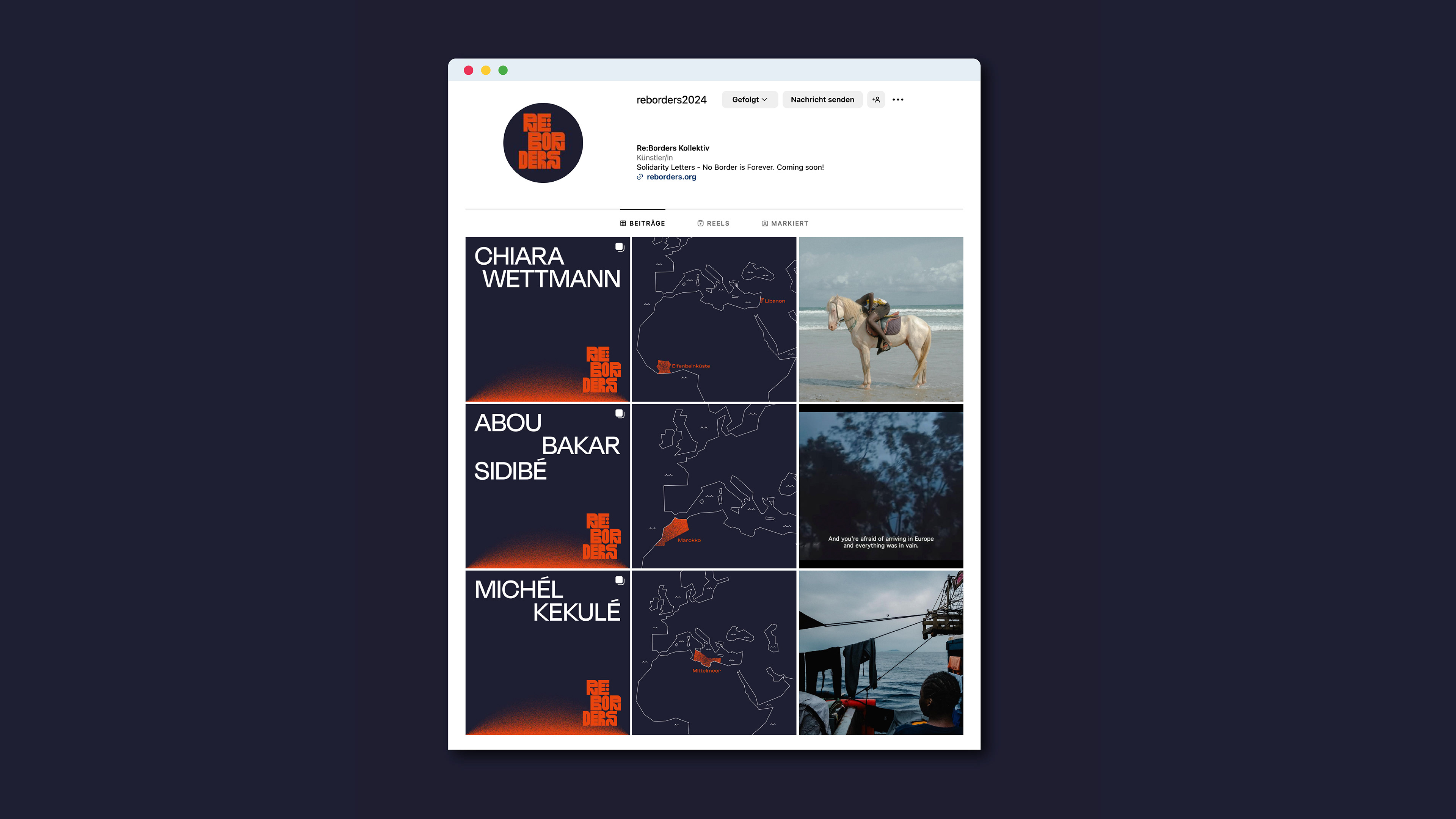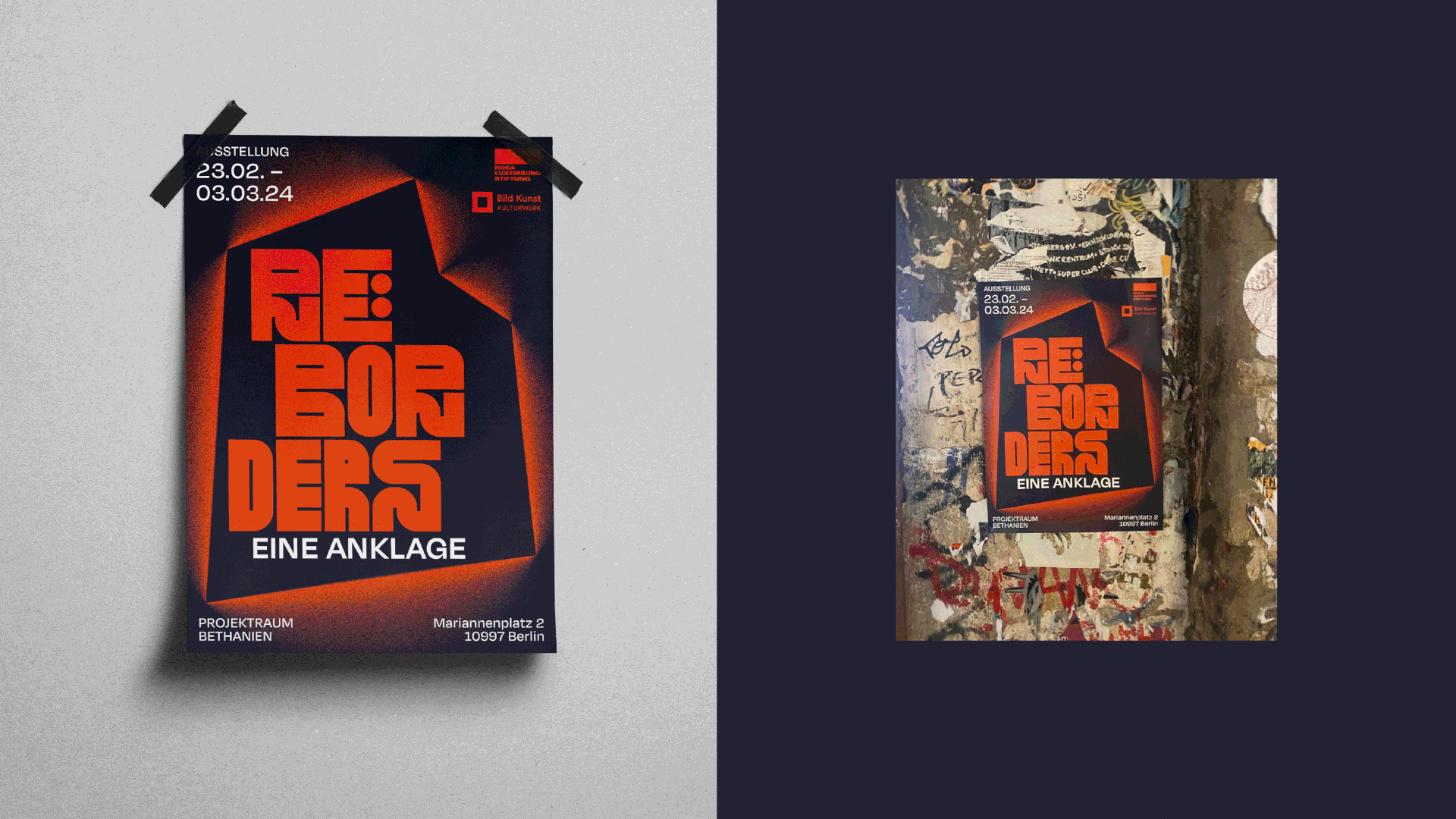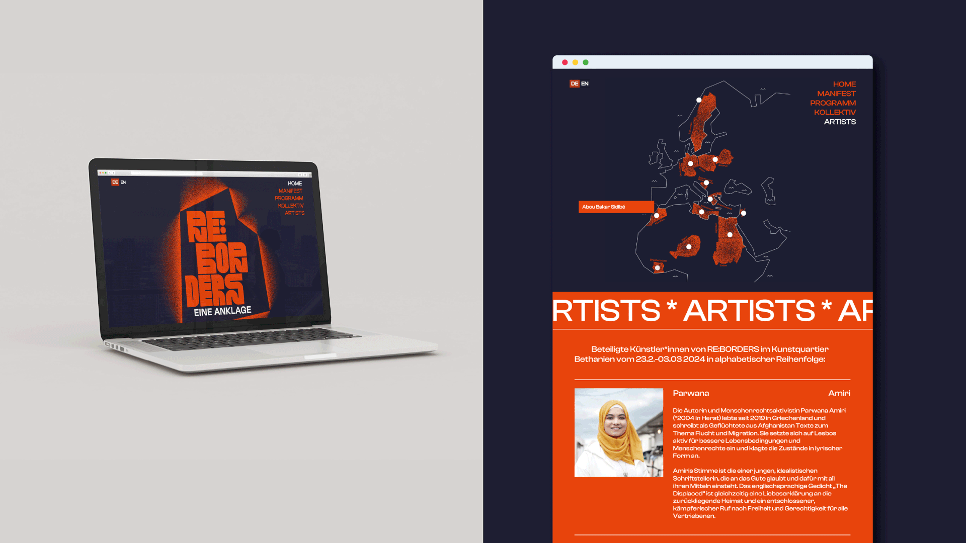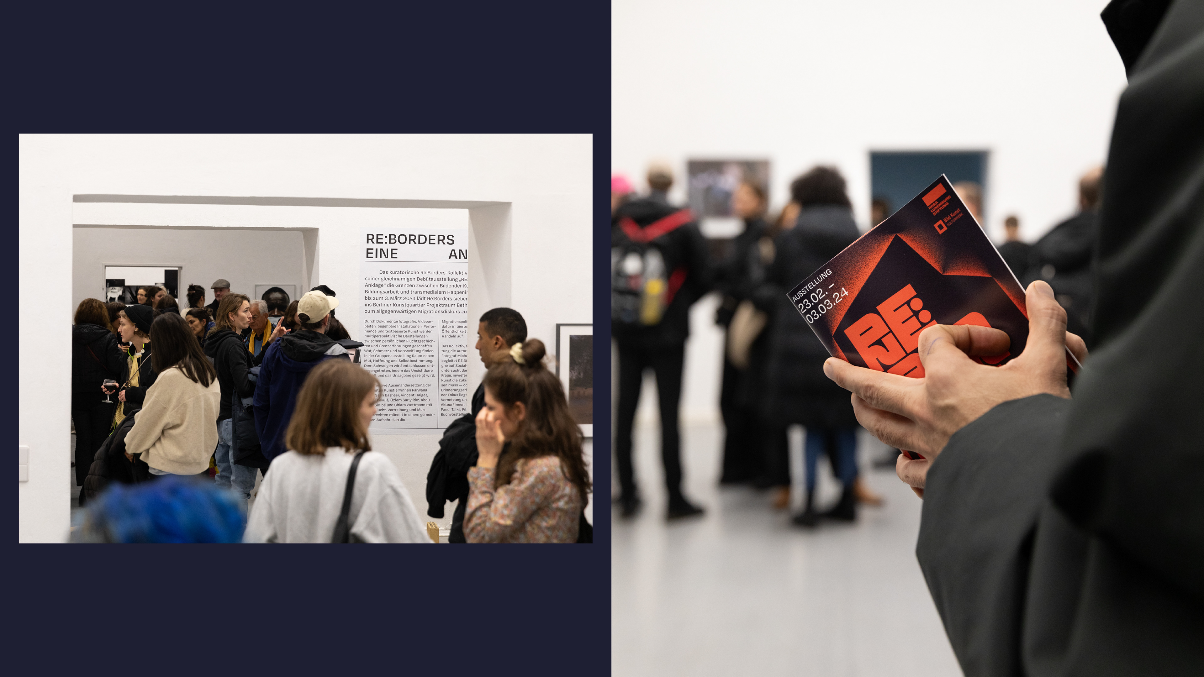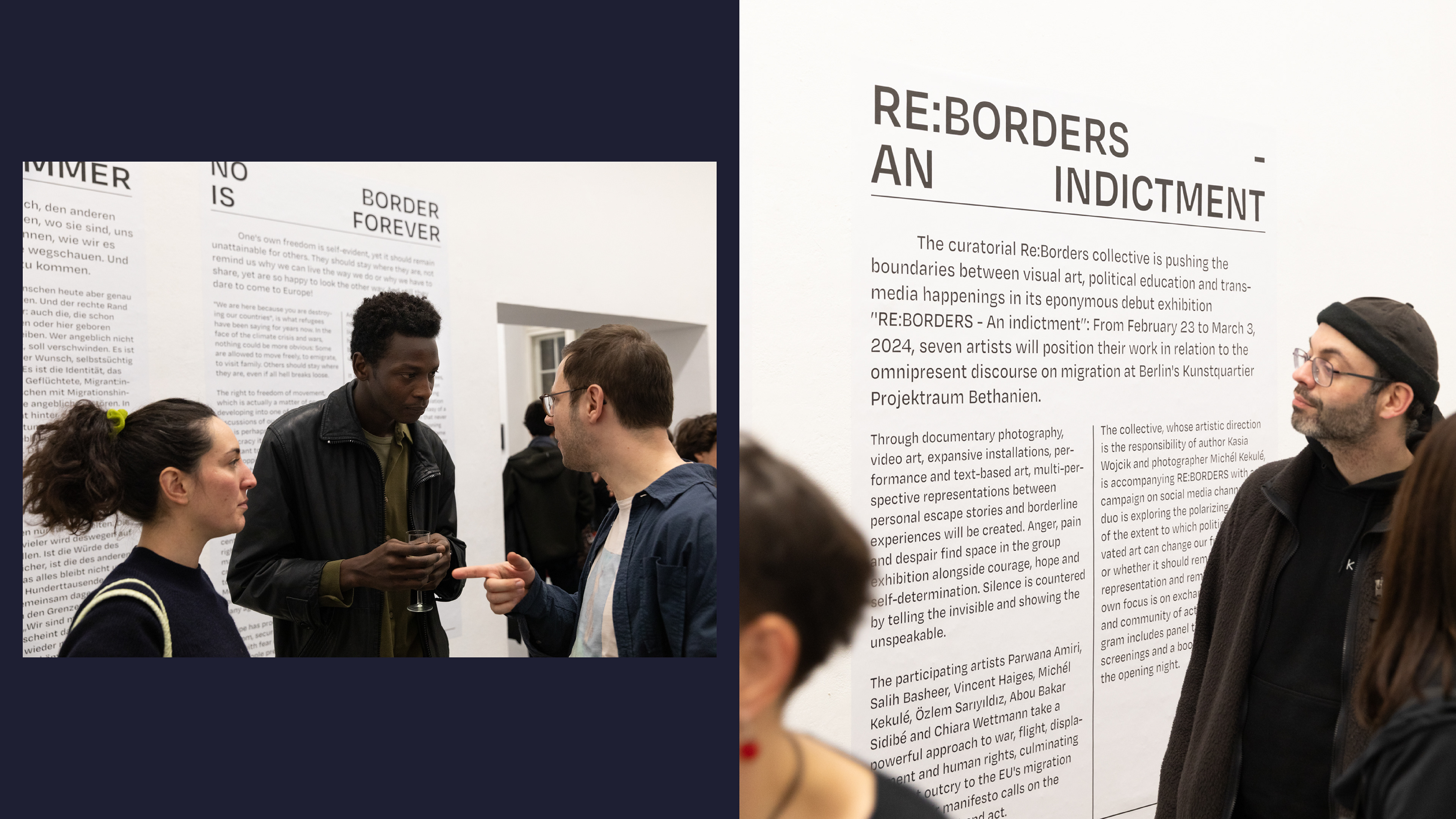 Vom 23. Februar bis 3. März 2024 reflektierten sieben Künstlerinnen im Berliner Kunstquartier Bethanien den aktuellen Migrationsdiskurs. Fotografien, Videoarbeiten, Installationen und Performances von Parwana Amiri, Salih Basheer, Vincent Haiges, Michél Kekulé, Özlem Sariyildiz, Abou Bakar Sidibé und Chiara Wettmann setzen sich mit Krieg, Flucht und Menschenrechten auseinander, kritisieren die EU-Migrationspolitik und fordern zum Nachdenken und Handeln auf.
